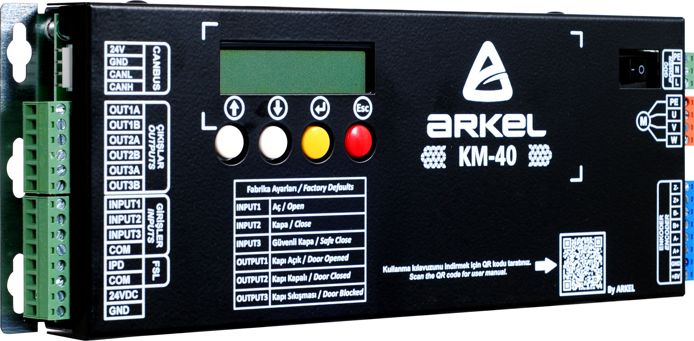 Arkel KM-40, 220 VAC motorlu teleskopik asansör kapıları için tasarlanmış, yüksek konforlu ve akıllı bir kapı kontrol kartıdır.